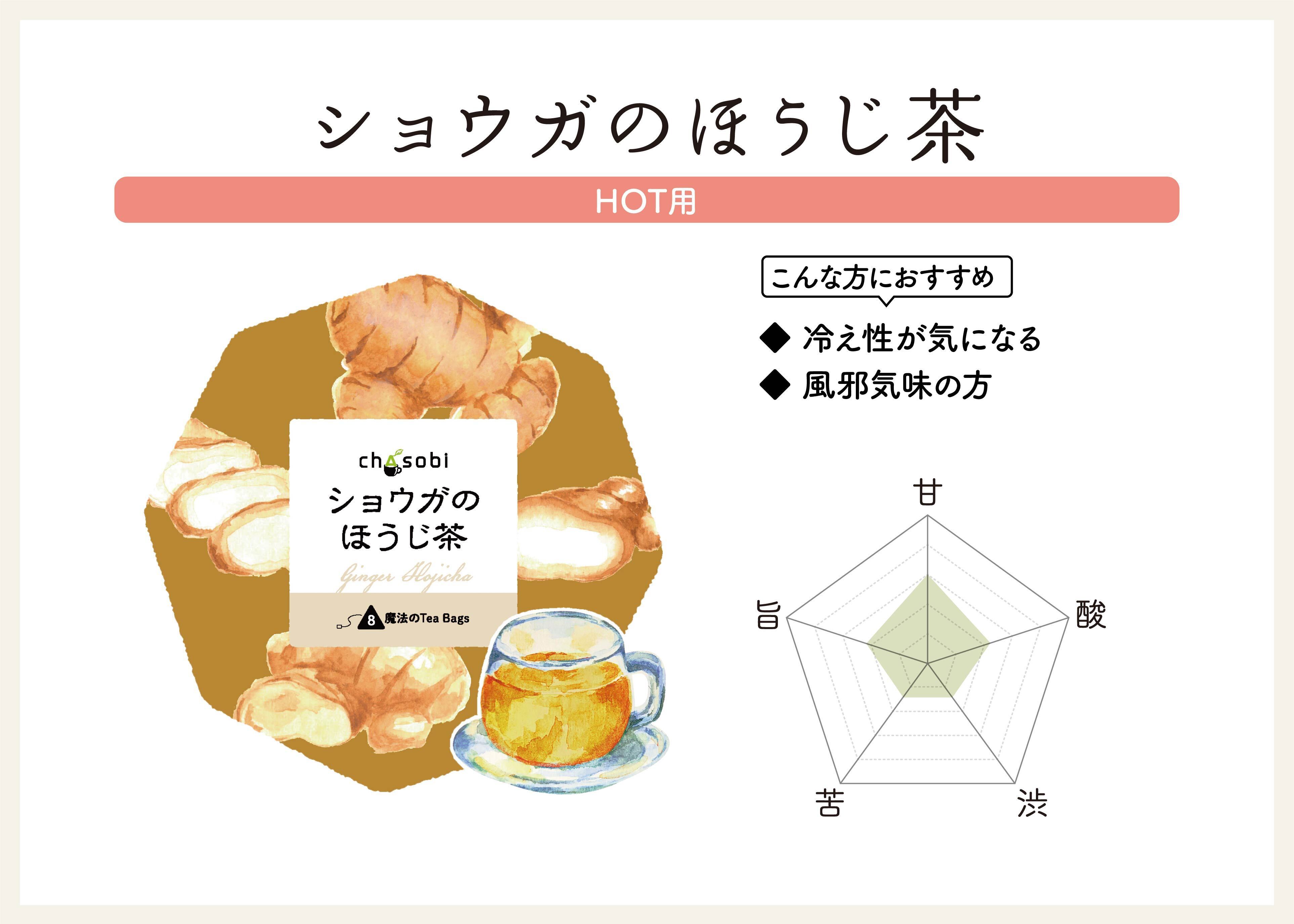 香り豊かな「炒りたて」ほうじ茶をベースに、身体を内側からポカポカに温めてくれるショウガをブレンドしました。